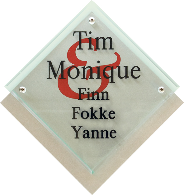 Glaslook is geen glas (glas is uiteraard erg breekbaar), maar een luxe en tegelijk stevige kunststofsoort (8 mm dikte) met de uitstraling van glas. Het materiaal is dan ook volledig doorzichtig en verkrijgbaar in verschillende kleurvarianten. Glaslook is uitstekend geschikt voor gebruik in en rondom uw woning. De tekst wordt in alle glaslook-naamborden gegraveerd, waardoor uw naam niet weg kan slijten of vervagen. Het bijzondere aan glaslook is dat het aan de achterzijde ingegraveerd wordt, dit in tegenstelling tot andere kunststofsoorten. Hierdoor blijft het materiaal aan de voorzijde glad en krijgt het een zeer luxe uitstraling. Tot slot: Glaslook wordt geleverd met afstandbusjes waardoor u het naambord eenvoudig op een korte afstand van de muur kunt monteren.