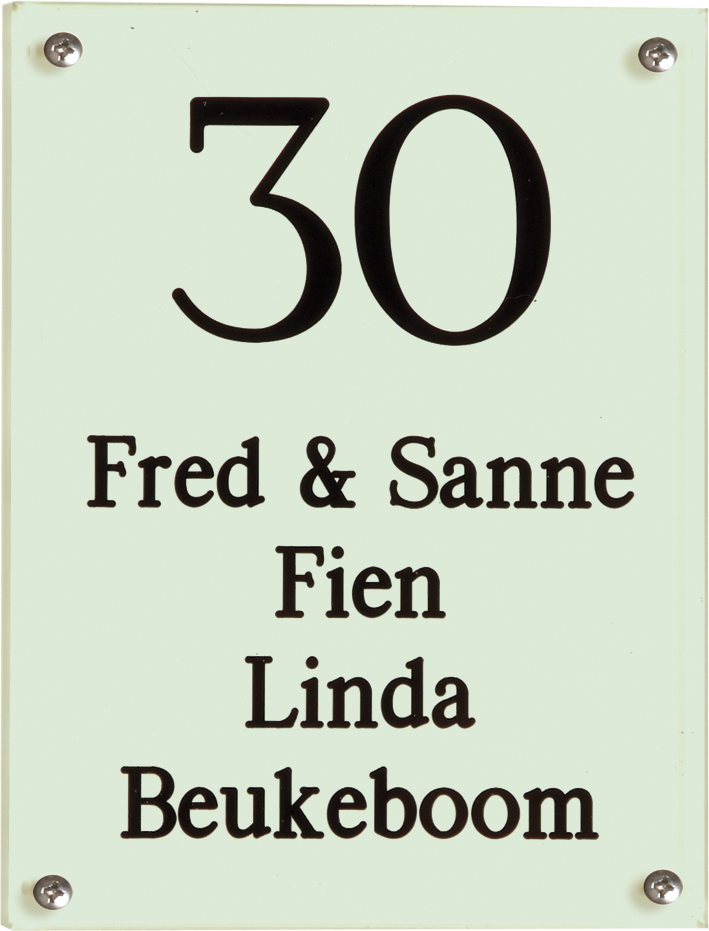 Glaslook is geen glas (glas is uiteraard erg breekbaar), maar een luxe en tegelijk stevige kunststofsoort (8 mm dikte) met de uitstraling van glas. Het materiaal is dan ook volledig doorzichtig en verkrijgbaar in verschillende kleurvarianten. Glaslook is uitstekend geschikt voor gebruik in en rondom uw woning. De tekst wordt in alle glaslook-naamborden gegraveerd, waardoor uw naam niet weg kan slijten of vervagen. Het bijzondere aan glaslook is dat het aan de achterzijde ingegraveerd wordt, dit in tegenstelling tot andere kunststofsoorten. Hierdoor blijft het materiaal aan de voorzijde glad en krijgt het een zeer luxe uitstraling. Tot slot: Glaslook wordt geleverd met afstandbusjes waardoor u het naambord eenvoudig op een korte afstand van de muur kunt monteren. Glaslook een zeer exclusieve kunststofsoort dat tegen een stootje kan!