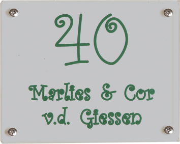 Glaslook is geen glas (glas is uiteraard erg breekbaar), maar een luxe en tegelijk stevige kunststofsoort (8 mm dikte) met de uitstraling van glas. Het materiaal is dan ook volledig doorzichtig en verkrijgbaar in verschillende kleurvarianten. Glaslook is uitstekend geschikt voor gebruik in en rondom uw woning. De tekst wordt in alle glaslook-naamborden gegraveerd, waardoor uw naam niet weg kan slijten of vervagen. Het bijzondere aan glaslook is dat het aan de achterzijde ingegraveerd wordt, dit in tegenstelling tot andere kunststofsoorten. Hierdoor blijft het materiaal aan de voorzijde glad en krijgt het een zeer luxe uitstraling. Tot slot: Glaslook wordt geleverd met afstandbusjes waardoor u het naambord eenvoudig op een korte afstand van de muur kunt monteren. Glaslook een zeer exclusieve kunststofsoort dat tegen een stootje kan!