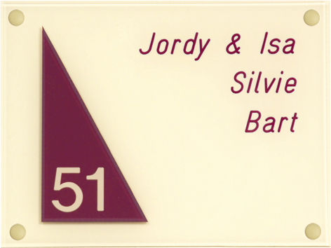 Gravoglas is een luxe en tegelijk stevige kunststofsoort (3 mm dikte), met de uitstraling van gekleurd glas, welke uitstekend geschikt is voor gebruik in en rondom uw woning. De tekst wordt in alle gravoglas-naamborden gegraveerd, waardoor uw naam niet weg kan slijten of vervagen. Het bijzondere aan gravoglas is dat het aan de achterzijde ingegraveerd wordt, dit in tegenstelling tot andere kunststofsoorten. Hierdoor blijft het materiaal aan de voorzijde glad en krijgt het een hele luxe uitstraling. Tot slot: de gravoglas-naamborden zijn standaard voorzien van schroefgaten (tenzij anders vermeld) en worden geleverd met afstandbusjes en afdekdopjes waardoor u het naambord eenvoudig op een korte afstand van de muur kunt monteren. Gravoglas een zeer luxe kunststofsoort dat tegen een stootje kan!