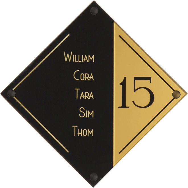 Gravoglas is een luxe en tegelijk stevige kunststofsoort (3 mm dikte), met de uitstraling van gekleurd glas, welke uitstekend geschikt is voor gebruik in en rondom uw woning. De tekst wordt in alle gravoglas-naamborden gegraveerd, waardoor uw naam niet weg kan slijten of vervagen. Het bijzondere aan gravoglas is dat het aan de achterzijde ingegraveerd wordt, dit in tegenstelling tot andere kunststofsoorten. Hierdoor blijft het materiaal aan de voorzijde glad en krijgt het een hele luxe uitstraling. Tot slot: de gravoglas-naamborden zijn standaard voorzien van schroefgaten (tenzij anders vermeld) en worden geleverd met afstandbusjes en afdekdopjes waardoor u het naambord eenvoudig op een korte afstand van de muur kunt monteren. Gravoglas een zeer luxe kunststofsoort dat tegen een stootje kan!
