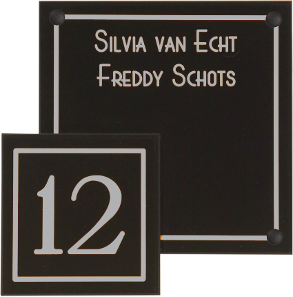Gravoglas is een luxe en tegelijk stevige kunststofsoort (3 mm dikte), met de uitstraling van gekleurd glas, welke uitstekend geschikt is voor gebruik in en rondom uw woning. De tekst wordt in alle gravoglas-naamborden gegraveerd, waardoor uw naam niet weg kan slijten of vervagen. Het bijzondere aan gravoglas is dat het aan de achterzijde ingegraveerd wordt, dit in tegenstelling tot andere kunststofsoorten. Hierdoor blijft het materiaal aan de voorzijde glad en krijgt het een hele luxe uitstraling. Tot slot: de gravoglas-naamborden zijn standaard voorzien van schroefgaten (tenzij anders vermeld) en worden geleverd met afstandbusjes en afdekdopjes waardoor u het naambord eenvoudig op een korte afstand van de muur kunt monteren. Gravoglas een zeer luxe kunststofsoort dat tegen een stootje kan!