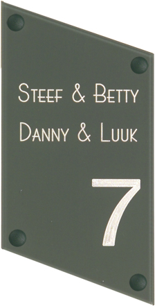 Gravoglas is een luxe en tegelijk stevige kunststofsoort (3 mm dikte), met de uitstraling van gekleurd glas, welke uitstekend geschikt is voor gebruik in en rondom uw woning. De tekst wordt in alle gravoglas-naamborden gegraveerd, waardoor uw naam niet weg kan slijten of vervagen. Het bijzondere aan gravoglas is dat het aan de achterzijde ingegraveerd wordt, dit in tegenstelling tot andere kunststofsoorten. Hierdoor blijft het materiaal aan de voorzijde glad en krijgt het een hele luxe uitstraling. Tot slot: de gravoglas-naamborden zijn standaard voorzien van schroefgaten (tenzij anders vermeld) en worden geleverd met afstandbusjes en afdekdopjes waardoor u het naambord eenvoudig op een korte afstand van de muur kunt monteren.