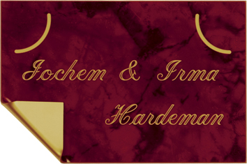 Het kunststof dat gebruikt wordt is een harde soort plastic (standaard 1,6 mm dikte), welke uitstekend geschikt is voor gebruik in en rondom uw woning. De tekst wordt in alle kunststofnaamborden gegraveerd, waardoor uw naam niet weg kan slijten of vervagen. De kunststofnaamborden bestaan uit twee kleuren: een onderliggende grondkleur en een bovenliggende topkleur. Wanneer uw naam in het naambord gegraveerd wordt, wordt de topkleur weg gegraveerd en verschijnt uw naam in de onderliggende kleur. Kunststof wordt standaard met een zelfklevende plaklaag geleverd. Daarmee kan het op vrijwel elke vlakke achtergrond gemakkelijk bevestigd worden. Het is echter niet geschikt om op een stenen of andere ongelijke achtergrond te bevestigen!
