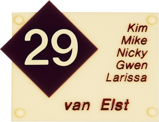 Perspex is een stevige kunststofsoort (3 mm dikte), welke uitstekend geschikt is voor gebruik in en rondom uw woning. De tekst wordt in alle perspex-naamborden gegraveerd, waardoor uw naam niet weg kan slijten of vervagen. De transparante perspex naamborden worden aan de achterzijde ingegraveerd (waardoor de voorkant glad blijft) en de gekleurde perspex naamborden worden aan de voorzijde ingegraveerd. Tot slot: de perspex-naamborden zijn standaard voorzien van schroefgaten (tenzij anders vermeld) en worden geleverd met afstandbusjes en afdekdopjes waardoor u het naambord eenvoudig op een korte afstand van de muur kunt monteren. Perspex een luxe kunststofsoort dat tegen een stootje kan!