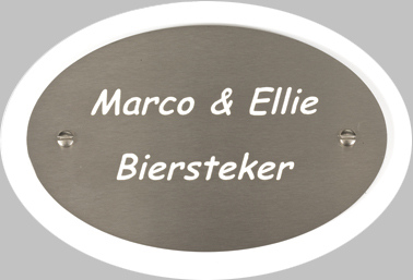 RVS is een zeer sterke staalsoort, welke uitstekend geschikt is voor gebruik in en rondom uw woning. RVS staat voor roest-vast-staal en is daardoor bijzonder weersbestendig, maar niet geheel vrij van onderhoud. Daarom dient uw RVS-naambord af en toe met HG snelglans (te verkrijgen bij de doe-het-zelf vakman en/of bouwmarkt) behandeld te worden. Het is niet verstandig de RVS-naamborden te poetsen, doordat de tekst op alle RVS-naamborden beletterd wordt; zo kan de tekstlaag niet beschadigen of vervagen, indien u geen belettering wenst, dient dit aan te geven in de opmerkingen, wij voorzien dan het naambord van een lasergravure, deze is altijd antraciet/zwart. Tot slot: alle RVS-naamborden worden standaard geleverd met RVS-bevestigingsmateriaal om zo oxidatie bij de schroefgaten tegen te gaan. (N.B. Bovenstaande geldt ook voor alle aluminium en RVS-look naamborden 1400/1500 serie met de uitzondering dat deze naamborden standaard zonder schroefgaten, maar zelfklevend geleverd worden). RVS uniek materiaal, geschikt voor allerlei stijlen, dat tegen een stootje kan!