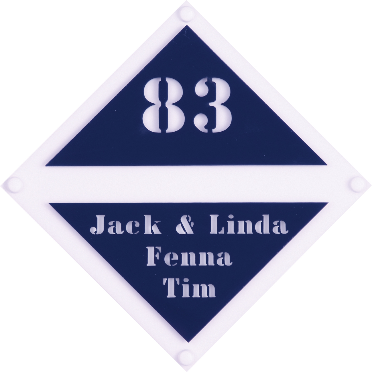 Sjabloonstyle is een unieke serie van het materiaal perspex. Perspex is een stevige kunststofsoort (3 mm dikte), welke uitstekend geschikt is voor gebruik in en rondom uw woning. In de serie sjabloonstyle worden twee kleuren perspex op korte afstand van elkaar gemonteerd. De tekst wordt in de serie sjabloonstyle door de bovenste plaat (de tekstplaat) heen gegraveerd, waardoor de onderliggende plaatkleur (de achterplaat) verschijnt. Uw naam kan hierdoor niet weg slijten of vervagen. Tot slot: de naamborden uit de serie sjabloonstyle zijn standaard voorzien van schroefgaten (tenzij anders vermeld) en worden geleverd met afstandbusjes en afdekdopjes waardoor u het naambord eenvoudig op een korte afstand van de muur kunt monteren.