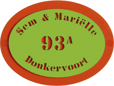 Sjabloonstyle is een unieke serie van het materiaal perspex. Perspex is een stevige kunststofsoort (3 mm dikte), welke uitstekend geschikt is voor gebruik in en rondom uw woning. In de serie sjabloonstyle worden twee kleuren perspex op korte afstand van elkaar gemonteerd. De tekst wordt in de serie sjabloonstyle door de bovenste plaat (de tekstplaat) heen gegraveerd, waardoor de onderliggende plaatkleur (de achterplaat) verschijnt. Uw naam kan hierdoor niet weg slijten of vervagen. Tot slot: de naamborden uit de serie sjabloonstyle zijn standaard voorzien van schroefgaten (tenzij anders vermeld) en worden geleverd met afstandbusjes en afdekdopjes waardoor u het naambord eenvoudig op een korte afstand van de muur kunt monteren.
